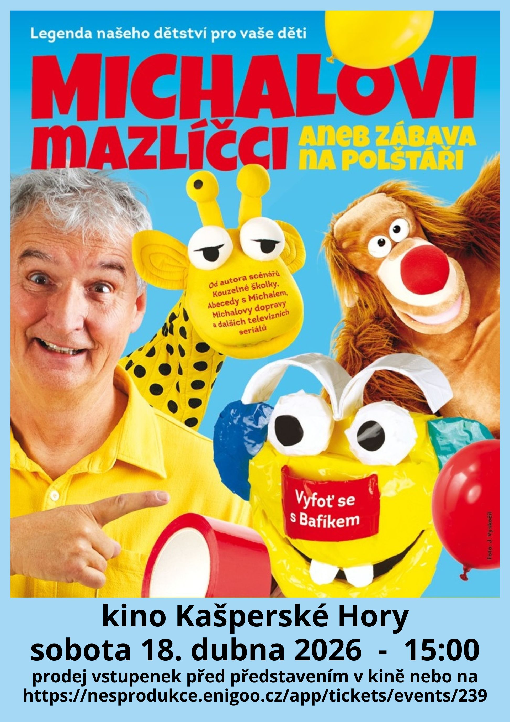 Dětské divadelní představení Michala Nesvadby v kašperskohorském kině. Vstupné 250 Kč.