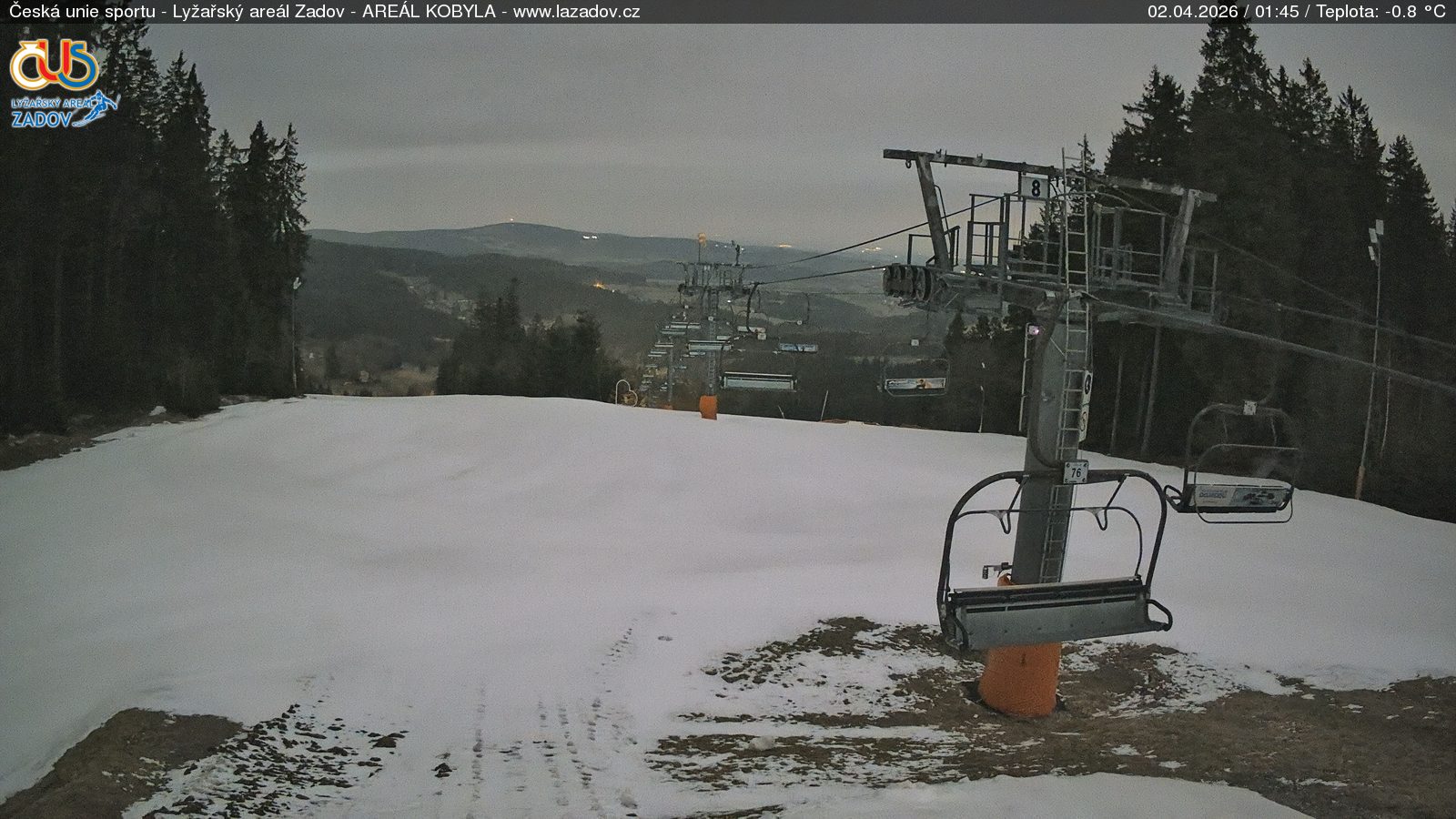 Obsah stránkyWebKameryStachyVelký obrázek21.12.2023 11:32:39Vyberte čas: Archiv: Dnes 1 den 2 dny týden měsíc 100 dnů rok Lyžařský areál Zadov - KobylaVelký obrázek02.04.2026 0:07:31Vyberte čas: Archiv: Dnes 1 den 2 dny týden měsíc 100 dnů rok Churáňov – horní stanice lanovkyVelký obrázek02.04.2026 0:07:23Vyberte čas: Archiv: Dnes 1 den 2 dny týden měsíc 100 dnů rok Znovunačtení stránky - Refresh pagePoznámka: pokud se některý z obrázků nenačte celý, právě se nahrává z kamerky na internet. Klikněte prosím na odkaz - Znovunačtení stránky